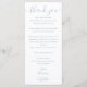 Um cartão de agradecimento de celebração de casamento azul empoeirado elegante, personalizado com sua mensagem especial de agradecimento em tipografia estilosa e programa de eventos e cortejo no verso. Um agradecimento especial para seus convidados. Concebido por Thisisnotme©