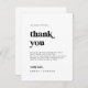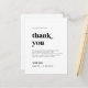Este cartão de agradecimento de recepção com tipografia preta moderna é perfeito para um casamento simples. O design minimalista em preto e branco apresenta uma fonte retrô, mas contemporânea, com um toque rústico boêmio único. Perfeito para qualquer época do ano. Deixe-o minimalista, como está, ou adicione seus próprios gráficos e ilustrações. Coloque esses cartões na mesa para cada um dos seus convidados na recepção do seu casamento. Personalize o cartão com seus nomes e uma mensagem especial de agradecimento.