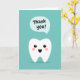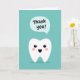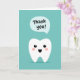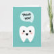 Cartão de agradecimento dental que pode ser usado para agradecer seu dentista ou qualquer pessoa que trabalhe com saúde bucal. O cartão apresenta um dente pequeno branco e feliz com um balão de fala dizendo "Obrigado" em um fundo azul turquesa. Texto personalizável dentro: Obrigado por manter nossos dentes saudáveis!