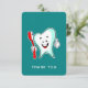 Cartões de agradecimentos plano com uma ilustração de um estilo de desenho animado, grande dente branco sorrindo alegremente segurando uma escova de dente vermelha e dando aos polegares uma placa para cima.