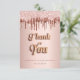 Um cartões de agradecimentos para um aniversário de 50 anos (ou qualquer idade). Uma cor de fundo azul rosa. Com rosa dourado, pingos cor-de-rosa, pintura pingada. Na frente do texto: Obrigado, seu texto e uma data. Obrigado Você é escrito com uma fonte no estilo do balão de ouro. Voltar: Personalize e adicione seu nome e nota de agradecimento.