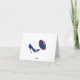 Cartão de agradecimento de casamento com tema de futebol elegante, feito em vermelho, branco e azul. Gráficos de um salto alto azul chutando uma bola de futebol vermelha, branca e azul decoram a frente do cartão, com uma moldura azul e vermelha em torno do fundo branco. O texto vermelho diz Obrigado. O texto azul dentro do cartão está pronto para personalizar.