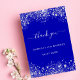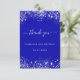 Um cartões de agradecimentos de aniversário de 18 anos (ou qualquer idade). Uma cor azul real de fundo. Decorado com falso brilho prateado, faíscas. Na frente, um grande guião escrito à mão branca e o texto: Obrigado. Voltar: Personalize e adicione seu nome e nota de agradecimento. O nome é escrito com um moderno estilo escrito à mão com traços. Para manter as hastes, exclua apenas o nome da amostra, deixe os espaços ou emoji na frente e depois do nome.