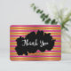 Um cartões de agradecimentos, com papel de xímer pérola escolhido para lhe dar um brilho bonito. se você mudar o papel, então a cor será plana. Projetado com um padrão elegante composto por listras horizontais metálicas cor-de-rosa, laranja e escura douradas. Um esplendor preto legal e moderno espalhado pelo centro com seu texto no meio.
