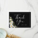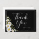 O design de cartões de agradecimentos de casamento bonito e dramático apresenta margaridas brancas de cor d'água canto sobre fundo preto com blocos de texto personalizáveis brancos em fontes modernas