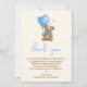 Chá de fraldas do tema do ursinho bonitinho, obrigado cartas para um bebê. Urso de pelúcia com um arco azul com corações azuis e balões azuis com todo o texto personalizado para agradecer aos convidados do chá.