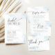 Com este cartões de agradecimentos Chá de panela você tem uma bela maneira de dizer obrigados para todos os presentes e desejos para a futura noiva. Ele foi projetado para um tema "Ela está na Nuvem Nove" ou Chá de panela Hen e tem nuvens azuis empoeiradas. Também estão disponíveis nesta coleção convites e sinais de boas-vindas correspondentes.