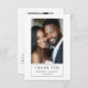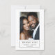 Elegante cartões de agradecimentos moderno de 2 fotos de casamento com uma fonte moderna na moda, e noiva e noiva sorridentes. Uma foto, com uma mensagem sincera nas costas. A fonte com nomes e data é uma fonte elegante clássica de serifa. Substitua as fotos de exemplo por suas próprias fotos favoritas de casamento.