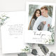 Este único design botânico apresenta um galho curvante de folhas elegantes de eucalipto com cor d'água com folhas artísticas de prata esboçadas e flores brancas silvestres. Este cartões de agradecimentos também apresenta um modelo de foto e uma mensagem editável no verso.