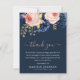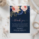 Um cartões de agradecimentos elegante para entregar a um funeral ou a um memorial ou enviar para amigos e familiares que mostraram amor e apoio durante o seu tempo de luto. Apresentando um fundo azul-marinho bonito, script de caligrafia manuscrito e fontes de serifa brancas, flores cor-de-rosa e azul-meia-noite com folhagem dourada falsa e uma nota de agradecimento que pode ser facilmente personalizada.