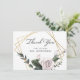 Este cartões de agradecimentos elegante apresenta um quadro geométrico dourado, acentuado por rosas de aquarelas pintadas manualmente, em cor rosa-claro e verde. No roteiro da cinza escura lê-se "Obrigado" com seu nome abaixo para personalizar. A parte traseira do cartão tem uma área para uma mensagem personalizada e assinatura acentuada por um quadro floral correspondente. Desenhada por Susan Coffey.