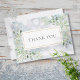 Apresentando folhas botânicas verdes e aquáticas de cor eucalipto em um fundo de flocos de neve de inverno que enquadra seu obrigado que você define na tipografia moderna. Você pode personalizar com seu próprio obrigado a mensagem no reverso ou se preferir adicionar sua própria mensagem manuscrita, exclua o texto. Uma maneira perfeita de dizer obrigado! Projetado por Thisnotme©