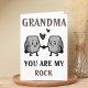 Um cartão de Dia de as mães feliz para avós rochosas e sólidas! Design apresenta duas rochas bonitas de mãos dadas com a mensagem "Vovó, você é minha rocha. Eu nunca te levarei por granito!" Texto castanho e preto. Personalize-o e adicione a sua própria mensagem pessoal.