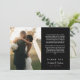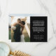 Cartões de agradecimentos romântico de casamento impresso com duas das suas fotos de casamento, uma menor de um lado e uma maior do outro lado. Obrigado e sua data de casamento escrita em uma fonte branca e elegante com seus nomes em um roteiro romântico com um obrigado impresso que você escreve sobre um fundo preto.