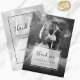 Um elegante Cartões de agradecimentos de casamento. Na frente, há uma foto escondido e branca da noiva e do noivo se beijando em um parque. (Ele tem um filtro preto e branco; portanto, se você substituí-lo por uma foto colorida, sua foto ficará preta e branca). O texto é escrito a preto num pequeno quadrado branco retangular transparente, rodeado por um quadro branco fino, com as palavras "obrigado você" num roteiro moderno. No verso, há a mesma foto, mas transparente, descolorada para branco, e uma obrigado que você envia. Todo o texto no verso é dentro de um quadro preto retangular. A foto marcadora da noiva e do noivo beijando no parque é a IA gerada pelo Photoshop. Eu tenho o direito de usar minhas imagens geradas, inclusive para uso comercial.