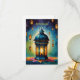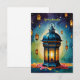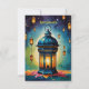 Uma ilustração digitalmente criada de uma lanterna azul ornamentado central com dentro de vela acesa, colocada contra um pano de fundo de um céu noturno estrelado com outras lanternas menores e penduradas. A lanterna principal é detalhada com recortes geométricos e fica em uma base colorida, estilizada, floral ou em forma de estrela. O plano de fundo passa de um azul profundo no topo para uma mistura mais clara, com cor d'água, de blues, verdes e amarelos, sugerindo um céu noturno com uma dica de amanhecer ou anoitecer. As lanternas menores são variadas em tamanho e penduradas em alturas diferentes, acrescentando profundidade à cena. O estilo geral lembra a pintura aquarela com aprimoramentos digitais, criando uma atmosfera etérea e macia, muitas vezes associada a temas festivos ou espirituais, potencialmente relacionados a comemorações do Ramadã devido ao uso frequente de lanternas nesse contexto.