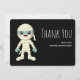 Cartões de agradecimentos plano com uma imagem legal do Dia das Bruxas. Uma múmia enrolada em suas ligaduras. Feliz rosto sorridente. Uma criatura adorável e fofa.