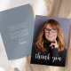 A frente deste convite para aniversário de 40 anos apresenta a foto do convidado de honra com as palavras "obrigado você" na elegante cobertura de script de caligrafia branca. Uma tela escura ajuda a tornar o texto pop. Personalize o lado inverso com sua mensagem pessoal em fontes de sans serif brancas e seu nome em script em um fundo azul empoeirado.