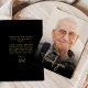 A frente deste convite de 90 apresenta a foto do convidado de honra com as palavras "obrigado você" na moderna cobertura de script de escrita manual de cor dourada. Uma tela escura ajuda a tornar o texto pop. Personalize o lado inverso com sua mensagem pessoal em fontes de sans serif de cor dourada e seu nome em script em um plano de fundo preto.