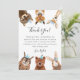 Cartões de agradecimentos de festa de aniversário de uma criança com um tema de floresta bonito, com ilustração desenhada à mão de um guaxinim, raposa, veado, coruja, urso e coelho. O texto padrão obrigado os convidados para vir à parte e para os presentes. Personalize este produto adicionando seu nome na parte inferior.