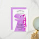 Cartão de agradecimento de festa de aniversário engraçado e fofo para a festa temática de dinossauro do seu filho. Ilustração em estilo de desenho animado de um dinossauro rosa. O t-rex está usando um chapéu de festa de princesa rosa. Acima do t-rex está escrito "Obrigado por passar". No corpo do dinossauro há uma mensagem que agradece ao convidado por vir e pelos presentes. Adicione o nome da criança no final. O texto é facilmente editável online.