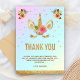 Encontrem seus hóspedes com este lindo cartões de agradecimentos de festa de aniversário de unicórnio com um belo rosto de unicórnio dourado e flores bonito com tipografia moderna em um fundo pastel de gradiente do arco-íris.