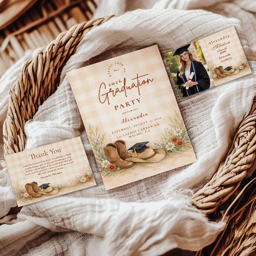 Celebre seu graduado com um design inspirado no oeste americano, apresentando botas clássicas de cowgirl, detalhes do chapéu de formatura e delicadas flores silvestres tecidas por meio de gramíneas suaves da pradaria. A paleta neutra terrosa de bege, sage, azul poeirento e terracota quente cria uma estética refinada de rancho que se sente moderna e atemporal. Ideal para graduados que amam o campo, garotas de rodeio ou qualquer pessoa que se sinta em casa sob céus abertos. Uma mistura equilibrada de charme rústico e detalhes botânicos elegantes para uma celebração memorável.