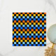 A vibrant checkerboard pattern featuring alternating rows of orange, yellow, light blue, and blue squares against a black background. The design is bold and energetic.