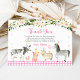 Este lindo cartão de agradecimento de aniversário apresenta animais da fazenda em aquarela com detalhes florais rosa, confetes e uma borda xadrez rosa.