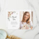 Este cartões de agradecimentos de Confirmação bonito, feminino, apresenta buquês rústicos boho de flores aquáticas em tons de pêssego, marfim e rosa com lindas folhas verdes. Há também uma elegante cruz dourada e uma tipografia moderna da escrita. Adicione sua foto pessoal.