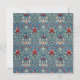 Intricate floral pattern with red, cream, and green leaves on a blue background. Symmetrical design evokes a classic, elegant, and ornate feel.
