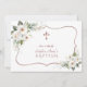 Design único com flores brancas de aquarela em torno de uma falso quadro de ouro rosa, cruz de ouro falso, caligrafia moderna, tudo sobre fundo branco; no verso do obrigado você envia a mensagem, o mesmo design. Use a ferramenta Personalizar para adicionar suas informações. Para itens correspondentes, por favor, visite minha Coleção de Celebrações de Natal Batismo.