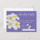 Um design floral suave e delicado com flores brancas havaianas Frangipani ou Plumeria em fundo periwinkle. Escrita elegante que acentua as elegantes flores brancas e amarelas. Um pacote de convite perfeito para o casamento na praia, casamento havaiano, casamento de destino na ilha tropical e muito mais.
