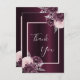 Um fundo burgundy profundo, decorado com florais robustos e cor-de-rosa.Na frente, um roteiro com letras grandes e o texto: Obrigado. Voltar: Personalize e adicione sua nota de agradecimento e seu nome.