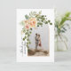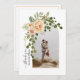 Pêssegos com flores aquáticas, arco com fotografia Obrigado casamento outono cartão plano. Esta adorável design de casamento apresenta um arco com flores de cacto de pêssego e folhas verdes no canto esquerdo e sua foto. Os nomes estão na tipografia de guião no fundo do pêssego.