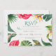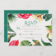 Este design de cartão de casamento RSVP apresenta um quadro colorido de flores e folhas tropicais, complementado por elegante tipografia retrô personalizável. É um design moderno, sofisticado, perfeito para os cenários tropicais... e deve ter para o seu casamento.