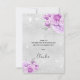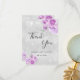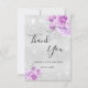 Um cartões de agradecimentos para um aniversário de 50 anos (ou qualquer idade). Uma cor de fundo metálica de aparência fina prateada. Decorado com flores roxas e pó brilhante falso. À frente, um grande texto escrito à mão e o texto: Obrigado, seu texto, título e uma data. Voltar: personalize e adicione seu nome e nota de agradecimento.