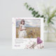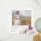 Um bonito cartão com fotos com borboleta roxa no galho com flores. Pequenas borboletas pastéis no topo à esquerda voam para dentro do quadro fotográfico, que é enquadrado em roxo. Enquanto exibido como um cartão de primeira comunicação, este design funcionaria perfeitamente por muitas ocasiões.