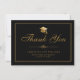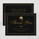 Envie um cartões de agradecimentos elegante para sua família e amigos para obrigado-los pelo apoio deles. Este design apresenta uma ilustração de um boné de formatura na frente com um script clássico em ouro falso em um plano de fundo preto que lê. "Obrigado" com seu nome, escola e classe/ano abaixo para personalizar, acentuado por um divisor de ouro florescente. A parte de trás do cartão tem uma mensagem e uma assinatura personalizadas. Desenhado pela artista ©Susan Coffey.