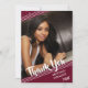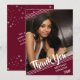 Linhas brancas simples e limpas contra um fundo burgundy/maroon editável e estrelas prateadas desbotadas com um título de script de pincel OBRIGADO e ano de graduação sotaque seu nome de formando e uma de suas fotos. A parte traseira apresenta um padrão de estrelas desbotado e um local para digitar em uma mensagem genérica de obrigado- você (você pode deletar o texto de exemplo para deixar o vazio para mensagens manuscritas pessoais) em um plano de burgundy/maron editável que você pode mudar para coordenar com sua foto, cores da escola ou cores do tema do partido. DICA DA FOTO: Para obter resultados mais rápidos/melhores, na frente, escolha uma foto com o assunto no meio de um retângulo horizontal para acomodar a colocação na diagonal. e/ou recorte-a em uma forma de retângulo largo ANTES de carregar e preencherá perfeitamente o espaço de fotos. Entre em contato com o designer se você quiser que este design seja modificado, em outro produto ou quiser coordenar itens para o conjunto de sua parte.