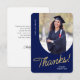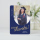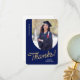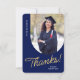 Este cartões de agradecimentos de formando plano apresenta uma foto vertical com uma borda arqueada. Personalize este cartões de agradecimentos azul e ouro marinho com sua própria mensagem ou use a mensagem mostrada.