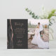 Mande a sua família e amigos um obrigado especial de casamento com esses cartões com fotos personalizados. À esquerda, as palavras "obrigado você" aparecem em uma elegante tipografia de escrita manual de cor rosa em um fundo preto de slate sobre uma breve e editável mensagem de obrigados aos convidados de casamento em letra copperplate, com seus nomes abaixo. Uma aquarela preta agata borda aparada com rosa dourado falso decora a borda esquerda. O verso fornece espaço para uma segunda foto horizontal.