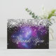 Crie seu próprio aniversário elegante, cartas de agradecimento. Brilhante prata brilhante com brilhos contra uma linda foto celestial negra, azul e roxa. Todos os efeitos brilhantes e bobos brilhantes desta design de menina moderna são criados com gráficos digitais. Um design criativo para a sua celebração celestial de aniversário. Você pode substituir a imagem do espaço cósmico por sua própria imagem, se quiser.
