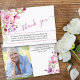 Cartões de agradecimentos funerário com guião manuscrito elegante e arranjos de aquarelas de flores rosa e roxas. O modelo está preparado para você adicionar uma foto 'em memória amorosa' às costas com o nome de seu ente querido, assim como sua mensagem personalizada de obrigados na frente.