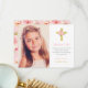 Este elegante design de cartões de agradecimentos da Primeira Comunhão apresenta uma foto da sua filha com um na moda cor-de-rosa, ouro e cinza que pode ser totalmente personalizado, acentuado por uma cruz dourada decorada com um bonito arranjo de flor cor-de-água rosa. Um fundo de rosa claro com padrão floral coordenado de cor-de-rosa pastel, pincel, dália de pêssego e flores de rosa e verde se veste na parte de trás do cartão.