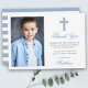 O Elegante Cartões de agradecimentos da Primeira Comunhão com a Cruz de Prata. Frente fotográfica. Script Azul Claro. Lixado Para Trás.