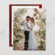 Design elegante e simples com modelo vertical de fotos com o seguinte script de caligrafia "Obrigado" (a cor pode ser personalizada usando o selecionador de cores) e campos de texto editáveis. O verso apresenta crista floral de ouro desenhado à mão com campos de texto para o seu monograma, embelezado por um spray colorido de flores e folhagem de Natal vermelhas, brancas e verdes. Inclui campo de texto adicional que pode ser excluído para sua mensagem pessoal manuscrita.