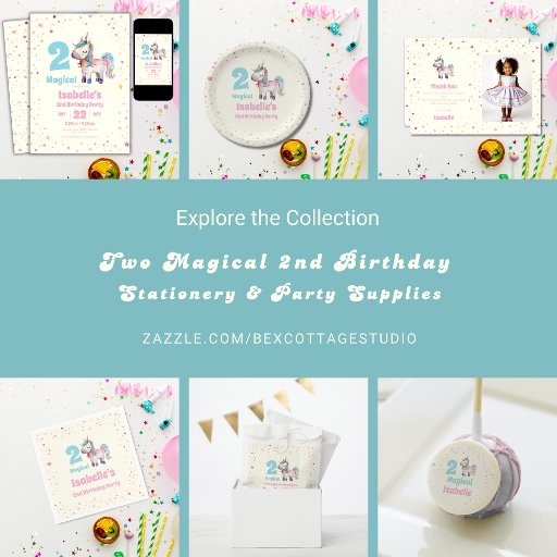 Celebre um marco mágico com a coleção *Unicorn Two Magical segundo aniversário Party*, exclusivamente na minha loja Zazzle! Este encantador material de papelaria e coleção de suprimentos para festas apresenta adoráveis designs unicórnios e bonito cores pastéis. Perfeito para o seu dia especial. Cada item é personalizável para adicionar seu toque pessoal, de convites e banners a pop de bolo e a bolsas. Crie com facilidade uma celebração de segundo aniversário chorosa e inesquecível. Que a magia comece! ✨ 🦄
