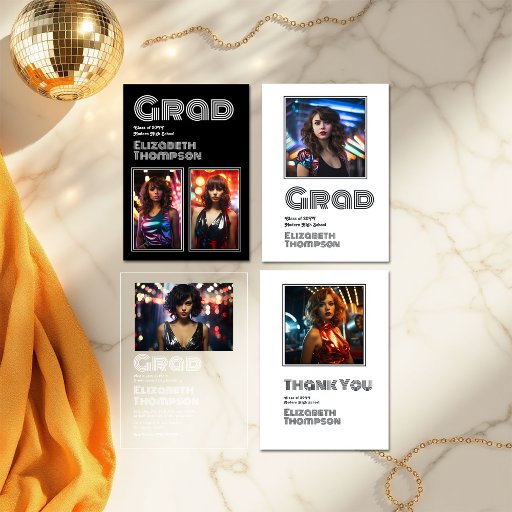 Expresse sua gratidão em estilo retrógrado com este cartões de agradecimentos ousado e sofisticado de graduação. Apresentando uma tipografia inspirada na safra, um layout branco e preto limpo e um espaço personalizável para fotos, este design complementa perfeitamente uma celebração de formando na moda. A estética elegante, moderna, mas nostálgica faz dela um eterno de manutenção, permitindo que os formandos compartilhem sua apreciação com um toque de brilho. Perfeito para formandos de segundo grau ou de faculdade que procuram uma placa única e elegante de obrigado-você.