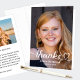O cartões de agradecimentos de graduação apresenta uma foto retrato do formando com um simples design de script cardíaco de "Obrigados" e uma sobreposição de texto personalizada em branco que pode ser personalizada com o nome do formando e o ano de classe. A dentro da placa inclui uma foto horizontal com a mensagem de obrigado personalizada.